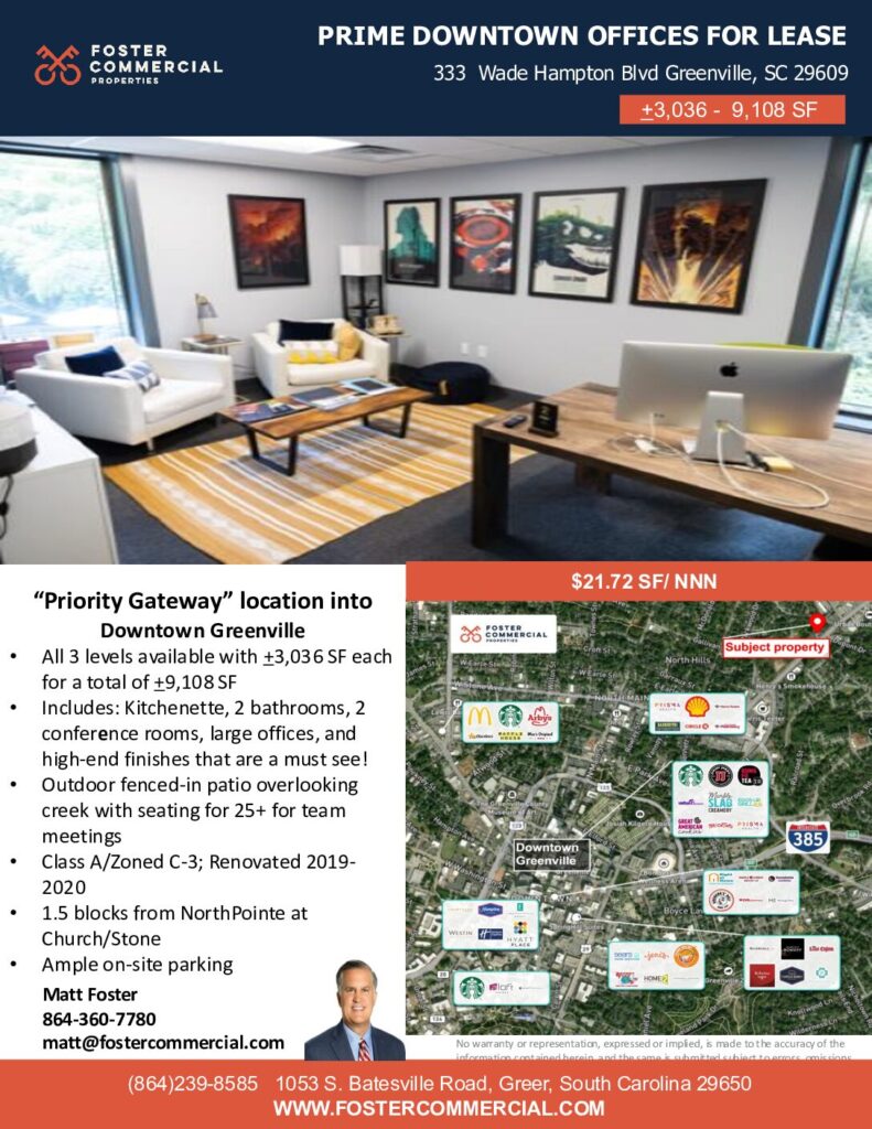 This Owner User style property is located in Greenville is currently Office and has been listed on Matt Foster. This property is listed at . It has bedrooms, bathrooms, and is . The property was built in year.